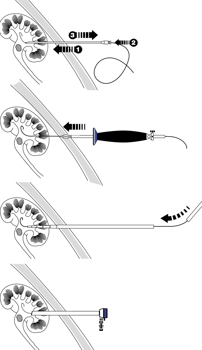 Почку прокалывают полой иглой, руководствуясь комбинацией рентгеноскопии и ультразвука. Вводят проводник через иглу для прокола. Затем иглу для прокола извлекают.