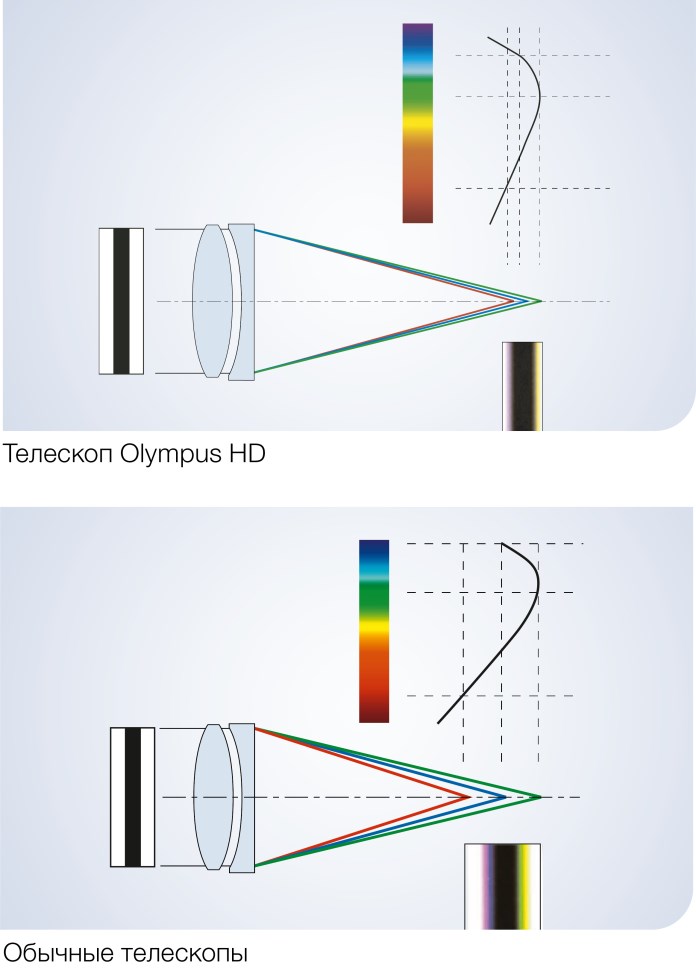 Свет, проходя через призму, разделяется на составляющие его цвета. Тот же эффект возникает в обычном лапароскопе и делает границы объекта размытыми, что ограничивает разрешение и контраст. Источником так называемой «цветной каймы» является хроматическая аберрация. Для получения изображений высокой четкости оптическая система Olympus HD снижает аберрацию.